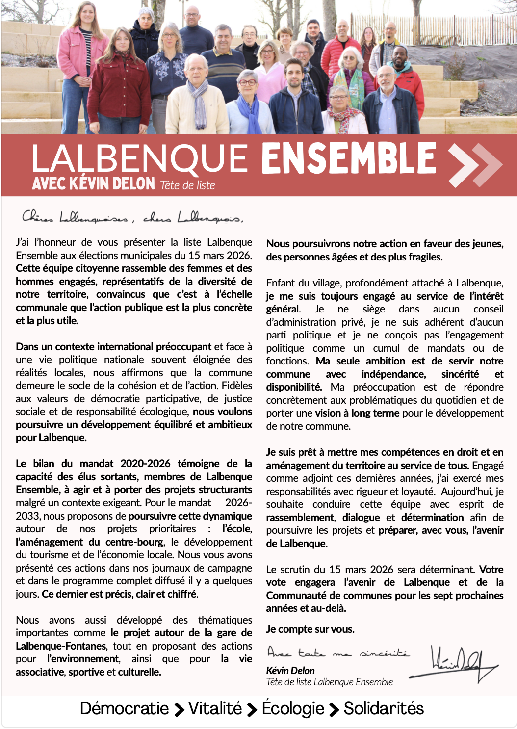 Pendant 6 ans, nous nous sommes attachés à appliquer cette démarche de manière collective. Aujourd’hui, je souhaite que durant le prochain mandat ce travail collectif se prolonge et se renforce pour le bien de tous avec “Lalbenque Ensemble”.